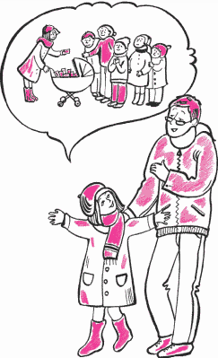 ЛЕНА: Пап, я хочу шоколадку, купи-и-и. ПАПА: По-моему, мама тебе уже вчера покупала. ЛЕНА: Одну, и то маленькую. ПАПА: А ты хочешь много. ЛЕНА: Да, много-много. ПАПА: Десять штук, а лучше пятьдесят. ЛЕНА (подхватывая игру): Нет, сто, тысячу!!! ПАПА: Мы покупаем тысячу шоколадок, нагружаем Павликову коляску и везем домой. ЛЕНА (смеется): Все удивляются: «Откуда у вас столько шоколада?» Собирается много детей, и мы начинаем всех угощать. Когда дети и родители мечтают вместе, ребенок знает, что взрослый слышит и разделяет его чувства.