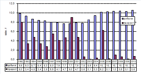 Рис.13. Динамика добычи и прироста запасов в Удмуртской Республике