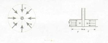Рис.27 Схема плоскорадиального потока в пласте а) горизонтальное сечение б) вертикальное сечение