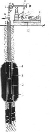 При насосном способе эксплуатации подъем нефти из скважин на поверхность осуществляется штанговыми и бесштанговыми насосами. Наиболее распространенным способом добычи нефти в нашей стране является эксплуатация нефтяных скважин штанговыми насосами с приводом от станков-качалок (СКН). Около 70% действующего фонда нефтяных скважин в нашей стране эксплуатируются глубинными насосами, которыми добывается более 30% от общего объема добычи нефти. Этому способствует простота оборудования и его обслуживание, небольшие затраты на обустройство скважин, что позволяет с высокими экономическими показателями эксплуатировать скважины с дебитами от нескольких килограммов до нескольких десятков тонн нефти в сутки. Штанговыми глубинными насосами можно добывать нефть с глубины до 3000 метров. В основном глубинно-насосную эксплуатацию применяют в среднедебитных (до 30-40 т/сут) и малодебитных (до 1 т/сут) нефтяных скважинах. Глубинный штанговый насос представляет собой плунжерный насос специальной конструкции. Привод насоса осуществляется с поверхности через колонну штанг. Поэтому такие насосы называются глубинными штанговыми насосами. Штанговые скважинные насосы предназначены для откачивания из нефтяных скважин жидкостей с температурой не более 130 °С, обводненностью не более 99 % по объему, вязкостью до 0, 3 Па-с, минерализацией воды до 10 г/л, содержанием механических примесей до 3, 5 г/л, свободного газа на приеме не более 25 %, сероводорода не более 50 мг/л и концентрацией ионов водорода рН 4, 2-8, 0. Верхняя штанга называется полированным штоком, который проходит через сальник 6 и соединяется с головкой балансира станка-качалки 7 с помощью траверсы и гибкой канатной подвески. Станок-качалка приводится в действие от электродвигателя через систему передач. Вращение электродвигателя 11 станка-качалки при помощи редуктора 12, кривошипа 10 и шатуна 9 преобразуется в возвратно-поступательное движения балансира 8, передаваемое плунжеру насоса 2 через колонну штанг 3. На устье скважины устанавливается тройник 5, в который поступает нефть со скважины. В верхней части тройника имеется сальниковое устройство, через которое пропущена верхняя штанга (полированный шток), и которое служит для герметизации устья и недопущения разлива нефти во время работы насосной установки.