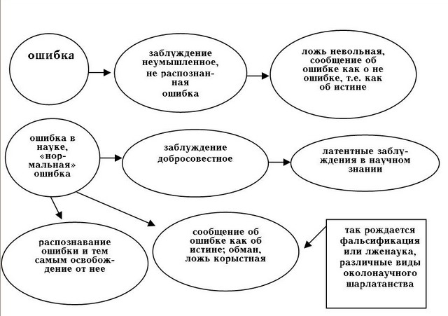 «Нормальной» или естественной ошибкой здесь является ошибка, которая распознается и рассматривается в качестве таковой в дальнейшем ходе исследования или научного познания. Однако даже в науке не все ошибки сразу распознаются. Поэтому в научное знание включены ошибки в качестве неумышленного или добросовестного заблуждения. Вполне естественные и постоянно совершаемые людьми (и, скорее всего, животными) ошибки обычно ведут к тому, что признаются как таковые и тем самым как бы исчезают, либо заменяясь истиной, либо уходя в область несуществующего для нас ничто. Если же ошибка сохраняется, поскольку не понимается, не осознается как ошибка, то она получает статус заблуждения различного качества. Во-первых, это латентные (скрытые) заблуждения, составляющие область нашего ошибочного знания, во-вторых, это непреднамеренные заблуждения, т.е. различные случаи самообмана неосознаваемого типа, близкие к типу латентных заблуждений, и непреднамеренные заблуждения субъективного или психологического типа. Особого рода случай составляет непреднамеренное заблуждение, вызванное бескорыстным введением в заблуждение. Скажем, если я сообщил о чем-то другим, не зная, что это ошибка, то я невольный лжец. В этом случае мы имеем не самообман, а непреднамеренный обман. Это значит, что в любом случае все эти виды непреднамеренного заблуждения могут считаться источниками добросовестного обмана. Но в основе всех этих видов заблуждений лежит самообман – весьма сложное явление. На это обращает внимание Д.И. Дубровский: «Особенность самообмана состоит, очевидно, в том, что тут обманывающий, обманываемый и обманутый совмещаются в одном лице… Это относится и к отдельной личности, и к социальному институту, к группе, народу, человечеству». [14] В рамках отличия добросовестного заблуждения от добросовестного обмана последний является результатом активного человеческого фактора, т.е. воздействием обманщика на обманываемого. При этом обманываемый должен быть обманут, что совсем не обязательно и происходит. Однако, подчеркнем еще раз, применительно к перечисленным выше случаям заблуждения ошибка как их причина является добросовестной, таковыми – не преднамеренными – являются и сами заблуждения. В случаях добросовестного заблуждения, передачи ошибочной информации от одного человека к другому (другим) мы имеем примеры «добросовестной», точнее бескорыстной лжи, т.е. непреднамеренного и бескорыстного введения в заблуждение. Но если причиной непреднамеренного обмана является непреднамеренное введение в заблуждение, а результатом – «добросовестная», невольная ложь, то причиной преднамеренного обмана являются осознанное заблуждение (знание ошибки как ошибки) или заведомая ложь. Правда и здесь не всегда все так просто. Дело в том, что в ряде случаев заведомой лжи ее субъекты, т.е. обманщики, могут переходить в состояние убежденности в том, что их заблуждение и не заблуждение вовсе, а что ни на есть настоящая правда. Это – один из случаев самовнушения или самогипноза, который позволяет обманщикам избегать душевного дискомфорта и угрызений совести. Ведь всем хорошо известно, что лгать нехорошо, сообщать заведомую ложь предосудительно, по меньшей мере, с моральной точки зрения, а в определенных случаях – и с юридической. Не случайно большинство шарлата
