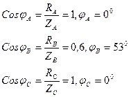 4. Углы сдвига фаз между фазным током и фазным напряжением в каждой фазе: