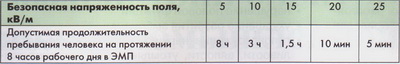 Основным содержанием указанных ГОСТ и СанПиН является наличие в них данных о предельно допустимых уровнях ЭМП различных источников, гарантирующих электромагнитную безопасность населения. В основе установления предельно допустимых уровней (ПДУ) лежит принцип пороговости вредного воздействия ЭМП на человека. В качестве ПДУ ЭМП предусмотрены такие уровни, которые при систематическом облучении в рабочем режиме для данного конкретного источника ЭМП не вызывают у людей (без ограничения пола и возраста) заболеваний и отклонений в состоянии здоровья. В табл.3 приведены допустимые уровни напряженности поля от ЛЭП промышленной частоты.