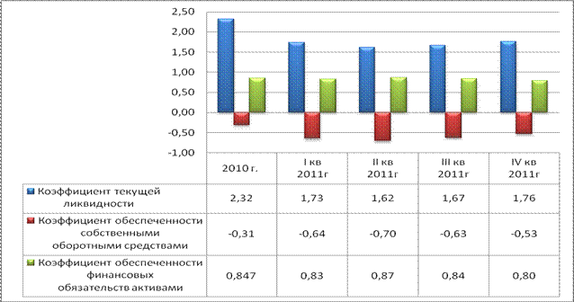 В 2011 г. наблюдалось улучшение финансово-экономических показателей работы ОАО «Камволь». Так, рентабельность реализованной продукции с минус 20 % в 2010 году выросла до 18, 3% в 2011 году. Ухудшились показатели платежеспособности предприятия. Так, если в 2010 году коэффициент ликвидности составил 2, 32, то в 2011 году он вырос до 1, 76 (норматив – не менее 1, 3), коэффициент обеспеченности собственными оборотными средствами – с «минус» 0, 31 снизился до «минус» 0, 53 (норматив – 0, 2), коэффициент покрытия финансовых обязательств активами – уменьшился с 0, 847 до 0, 8 (рисунок 3.2).