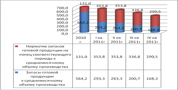 Рост объемов производства и продаж обусловит увеличение рентабельности реализации до 2, 4% и приведет к увеличению массы прибыли от реализации до 1 462 миллионов рублей. Коэффициент текущей ликвидности резко возрастет и достигнет 1, 76, а обеспеченности собственными оборотными средствами улучшится до «минус» 0, 53 Запасы готовой продукции на складах предприятия в оптовых ценах относительно среднемесячного объема производства планомерно снижались и составили 168, 3% на конец года против 564, 2% в 2010 году (рисунок 3.3).