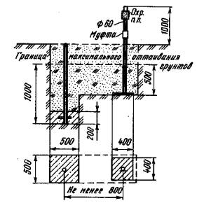Рис. 15. Внешнее оформление фундаментальных реперов в области сезонного промерзания грунтов Размеры даны в мм.