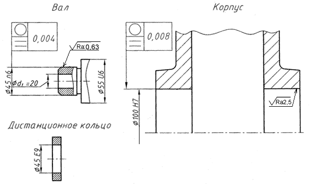 Схемы полей посадки с натягом (рис.7а) позволяют оценить возможное отклонение вала: E'b = TD + Nmin; для IT6 E'b = 19 + 55 = 74 мкм, для IT7 E'b = 30 + 55 = 85 мкм. Штрихами обозначены расчетные значения, без штрихов стандартные. Ближайшее стандартное основное отклонение находим по табл.3 для dk = 55 мм оно соответствует u и равно 87 мкм. Рассмотрим три варианта посадок: б) Примеры буквенных обозначений предельных отклонений размеров, а также шероховатости и допусков формы, представлены на рис. 8. На чертежах возможно применение цифрового, буквенного, комбинированного обозначения точности. Например,