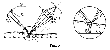 | где - фокусное расстояние линзы. Пленка при этом может иметь неодинаковую толщину. В этом случае в каждой точке изображения собираются множество пар пучков лучей, вышедших из разных точек источника , но лучи в этих парах когерентны между собой и все они имеют почти одинаковую разность хода, обусловленную толщиной пленки в том месте, которое сопряжено с данной точкой изображения. Положения интерференционных картин от каждой пары лучей будут совпадать, и суммарная картина будет идентична каждой отдельной, только намного ярче. Вообще говоря, разность хода пар от различных точек источника будет немного отличаться, так как разные лучи, прошедшие сквозь пленку для того, чтобы попасть в точку на верхней грани, сопряженную с точкой на экране, должны пройти разным путем (рис. 3 справа). Однако если источник света удален, а рельеф поверхности пленки достаточно гладкий, то различия в разностях хода будут пренебрежимо малы. Как правило, на практике такие условия выполняются.