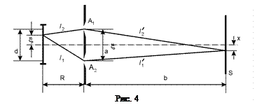 Полосы равной толщины. Иная ситуация возникает, если линза установлена таким образом, что в плоскость изображения проецируется поверхность пленки, т.е. отрезки, определяющие положение линзы удовлетворяют формуле Гаусса