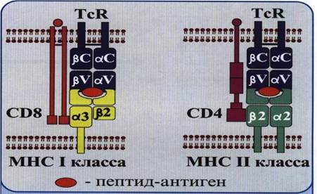 5-сурет. CD8 мен CD4. Т-лимфоциттер мен MHC І жә не ІІ кластардың кө мегімен пептид-антигеннің кө рінісі.