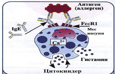 Жоғ арысезімталдық тың І типі – анафилаксиялық, аллергеннің бірінші тү суі плазмоциттерденIgЕ, IgG4 ө німінің бө лінуін тудырады - IgЕ -антиденелерінің ө ндірілуін Тһ 2 бө летін ИЛ-4 жә не ИЛ-10 ынталандырады, ал Тһ 1 бө летін – гамма интерферон жә не ИЛ-2 тежейді. Синтезделген IgЕ Ғ с-фрагменттері арқ ылы қ ан базофилдерінің жә не сілемейлі қ абық тардағ ы, дә некер тініндегі мес жасушаларының Ғ с-рецепторына (Ғ сε R1) бекінеді. Аллергеннің екінші рет тү суі кезінде мес жасушалар мен базофилдерде жасушалардың дегрануляциясын тудыратынIgЕ− дің аллергенмен (Ғ сε R1-дің антигенмен айқ асуы) кешеніқ алыптасады (28-сурет). - Гранулалардан тіндерге биологиялық белсенді медиаторлар бө лінеді: вазоактивті аминдер (гистамин), протеогликандар (гепарин), липидтік алмасудың ө німдері (лейкотриендер, простогландиндер жә не тромбоциттерді белсендіруші факторлар), ферменттер (триптаза, химаза, карбоксипептидаза, Gкатепсині) жә не цитокиндер (Ил-3, ИЛ-4, ИЛ-5, ИЛ-6, ИЛ-13, ГМ-КСФ, ФНО-α). - Хемотаксистік факторлар нейтрофилдерді, эозинофилдерді жә не макрофагтарды тартады. Эозинофилді хемотаксистік факторлар (ЭХФ) эозинофилдерді тартады, олар ферменттерді, катионды нә руыздарды, лейкотриендерді жә не эпителийді зақ ымдаушы негізгі нә руыздеарды бө леді. Аталғ ан компоненттер тегіс салалы бұ лшық еттердің жиырылуын, жү рек жұ мысының ә лсіздігін, коллапс дамуын, қ ан тамырлар ө ткізгіштігінің артуын, ісінулердің, қ ышынулардың пайда болуын жә не т.б. тудырады.