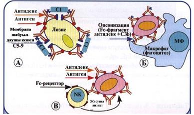 24-сурет. Анафилакиялық типі ІІ типі − цитоуытты. Жасушада орналасқ ан антиген IgG, IgM класты антиденелерімен танылады. “Жасуша-антиген-антидене” тү рінде ө зара ә рекеттескенде комплементтің белсендірілуі жү реді жә не жасушаның бұ зылысы ү ш бағ ыт (25-сурет): комплемент-тә уелді цитолиз (А); фагоцитоз (Б); антидене-тә уелді жасушалық цитоуыттылық ә сер (В)бойынша жү реді.