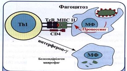 ІV типі − жоғ арысезімталдық тың баяу типі. Бұ л тү рі жасушалық иммунитетті белсендіретін антигеннің макрофагтармен жә не Тһ 1-лимфоциттермен ө зара ә рекеттесуі арқ ылы жү реді (27-сурет).