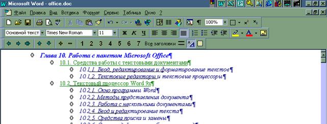 2. Структура документа фактически является его планом и представляет собой список заголовков различного уровня, имеющихся в документе. 3. При работе в режиме структуры на экране появляется панель инструментов Структура. 4. По умолчанию работа начинается с ввода заголовка первого (самого высокого) уровня. Для понижения уровня заголовка можно использовать клавишу TAB или кнопку Понизить уровень на панели инструментов Структура. Для повышения уровня используют кнопку Повысить уровень или комбинацию клавиш SHIFT+TAB. 5. Знак «плюс» возле заголовка указывает на наличие подразделов. Щелчок на этом значке позволяет выделить весь соответствующий раздел. Метод перетаскивания позволяет переставлять заголовки вместе с соответствующими разделами с одного места на другое. 6. Кнопки с цифрами на панели инструментов Структура позволяют свернуть все уровни ниже выбранного. Кнопки Свернуть и Развернуть позволяют сворачивать и разворачивать уровни заголовков поодиночке. 7. Когда план создан, ввод текста разделов выполняют в одном из обычных режимов. Переход выполняют с помощью пунктов меню Вид или щелчком на одной из кнопок в левом нижнем углу окна документа. 8. Если нужно одновременно видеть и структуру (план) документа и его содержание, следует дать команду Вид > Схема документа. В этом случае в левой части экрана открывается область, содержащая только заголовки. Переход к любому разделу документа выполняют щелчком на заголовке.
