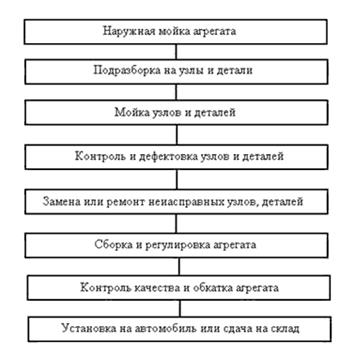 Рисунок 3.21 -Схема технологического процесса ремонта в отделениях Отремонтированные агрегаты возвращаются для установки на тот же автомобиль или сдаются на склад. Неисправные детали сдаются на склад в обмен на новые или отремонтированные. Негодные детали списываются в утиль, а нуждающиеся в ремонте передаются в производство или направляются на специализированные ремонтные предприятия. На многих предприятиях ремонт двигателей и других основных агрегатов производится в агрегатном отделении. Слесарно-механическое отделение предназначается для обработки деталей под ремонтные размеры, изготовления крепежных и других деталей (болтов, шпилек, втулок, пальцев и др.), для обработки деталей после термической обработки, подготовки их к сварке и обработке после сварки и т. п. Отделение выполняет эти работы по заявкам всех производственных подразделений. В кузнечно-рессорном отделении производят ремонт и изготовление деталей с применением нагрева (правка, горячая клепка, ковка деталей) и ремонт рессор, имеющих пониженную упругость или поломку отдельных листов. Собранные рессоры испытывают под нагрузкой. Изготовленные или отремонтированные детали передаются непосредственно на посты обслуживания и ремонта автомобилей, для дальнейшей обработки в слесарно-механическое отделение или сдаются на склад. Сварочное отделение предназначено для восстановления изношенных или поврежденных деталей наплавкой металла, осуществляет заварку трещин в металлических панелях кузова, кабины, оперения. Посты сварки отделяются от остальной части помещения металлическими экранами. Отделение выполняет работы по заявкам, записанным в контрольном талоне, и по заявкам всех подразделений СТО. В медницком отделении выполняют ремонт радиаторов, топливных баков, топливопроводов по заявкам, записанным в контрольных талонах, и по заявкам других подразделений СТО. В жестяницком отделении осуществляют ремонт крыльев (устранения вмятин, трещин, разрывов), подножек, брызговиков, капотов, облицовки, радиаторов, дверей и других частей кузова, изготавливают несложные детали кузовов. Рабочие выполняют работу как непосредственно на автомобилях, так и в помещении отделения. В малярном отделении окрашивают (частично или полностью) подвижной состав, подкрашивают номерные знаки, делают надписи на маршрутных досках автобусов и бортах кузовов, а в небольших СТО выполняют все малярные работы по оборудованию, зданиям и сооружениям. В столярном отделении производят ремонт и изготовление деревянных кузовов грузовых автомобилей, деревянных частей кабины, замков, петель, оковки крюков, стеклоподъемников и других деталей. Работы выполняются на постах ТР автомобилей и в помещении отделения. Обойное отделение предназначено для осуществления ремонта и изготовления подушек и спинок, сидений и внутренней обивки кузовов, а также изготовление чехлов на радиаторы и капоты двигателей. Работы производятся на постах ТР автомобилей и в помещении отделения. В радиотехническом отделении выполняют ТО и ремонт радиотехнического оборудования, применяемого на автомобилях и в СТО. В электротехническом отделении производят ТО и ремонт приборов электрооборудования подвижного состава. Приборы электрооборудования, неисправности которых невозможно устранить на постах обслужи