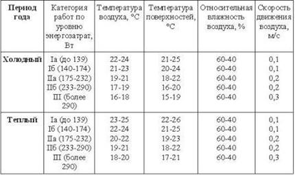 Установлены Санитарные правила и нормы для предотвращения неблагоприятного воздействия микроклимата рабочих мест, производственных помещений на самочувствие, функциональное состояние, работоспособность и здоровье человека. Государственный санитарно-эпидемиологический надзор и контроль за выполнением Санитарных правил осуществляется органами и утверждениями Федеральной службы по надзору в сфере защиты прав потребителей и благополучия человека, а ведомственный санитарно-эпидемиологический надзор и контроль – органами и учреждениями санитарно-эпидемиологического профиля соответствующих министерств и ведомств. Санитарные правила устанавливают гигиенические требования к показателям микроклимата рабочих мест, производственных помещений. Показателями, характеризующими микроклимат в производственных помещениях, являются: • температура воздуха; • температура поверхностей; • относительная влажность воздуха; • скорость движения воздуха; • интенсивность теплового облучения. Перечисленные показатели, характеризующие микроклимат на рабочих местах, разделяются по категориям проводимых работ (Iа, Iб, IIа, IIб, III). К категории Iа относятся работы с интенсивностью энерготрат до 120 ккал/ч (до 139 Вт), производимые сидя и сопровождающиеся незначительным физическим напряжением (ряд профессий на предприятиях точного приборо- и машиностроения, на часовом, швейном производствах, в сфере управления и т.п.). К категории Iб относятся работы с интенсивностью энерготрат 121-150 ккал/ч (140-174 Вт), производимые сидя, стоя или связанные с ходьбой и сопровождающиеся некоторым физическим напряжениям (ряд профессий в полиграфической промышленности, на предприятиях связи, контролеры, мастера в различных видах производства и т.п.). К категории IIа относятся работы с интенсивностью энерготрат 151-200 ккал/ч (175-232 Вт), связанные с постоянной ходьбой, перемещением мелких (до 1 кг) изделий или предметов в положении стоя или сидя и требующие определенного физического напряжения (ряд профессий в механосборочных цехах машиностроительных предприятий, в прядильно-ткацком производстве и т.п.). К категории IIб относятся работы с интенсивностью энерготрат 201-250 ккал/ч (233-290 Вт), связанные с ходьбой, перемещением и переноской тяжестей до 10 кг и сопровождающиеся умеренным физическим напряжением (ряд профессий в механизированных литейных, прокатных, кузнечных, термических, сварочных цехах машиностроительных и металлургических предприятий и т.п.). К категории III относятся работы с интенсивностью энерготрат более 250 ккал/ч (более 290 Вт), связанные с постоянными передвижениями, перемещением и переноской значительных (свыше 10 кг) тяжестей и требующие больших физических усилий (ряд профессий в кузнечных цехах с ручной ковкой, литейных цехах с ручной набивкой и заливкой опок машиностроительных и металлургических предприятий и т.п.).