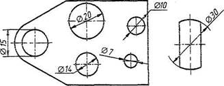 Рис. 27 НЕКОТОРЫЕ ПРАВИЛА НАНЕСЕНИЯ РАЗМЕРОВ (ГОСТ 2.307-68). Размеры на чертеже указывают с помощью выносных и размерных линий, а также размерных чисел. Размерные линии выполняют в виде прямолинейного отрезка или в виде дуги окружности с одной или двумя стрелками. Размерные числа без обозначения единицы измерения указывают линейные размеры в миллиметрах, угловые размеры указывают с обозначением единицы измерения в градусах, например, 30°. Общее количество размеров на чертеже должно быть минимальным, но достаточным для изготовления и контроля изделия. Размеры одного и того же элемента на разных изображениях повторять не допускается. Размерные и выносные линии предпочтительно наносить вне контура изображения (рис. 28). При нанесении размеров прямолинейного отрезка размерную линию проводят параллельно этому отрезку, а выносные -перпендикулярно ему. Выносные линии проводят, как правило, от линий видимого контура. Выносные линии должны выходить за концы стрелок размерной линии на 1...5 мм. При нанесении размера угла размерную линию проводят в виде дуги с центром в его вершине, а выносные линии -радиально (см. рис. 28).