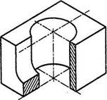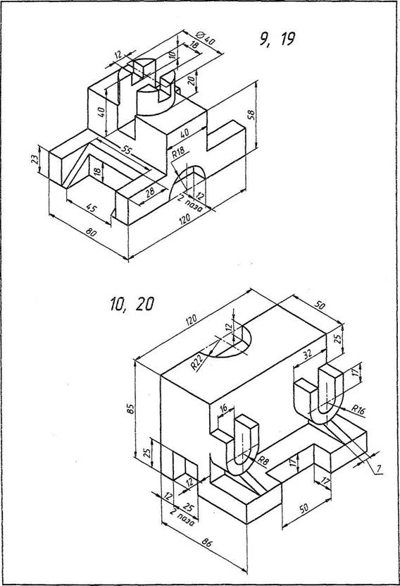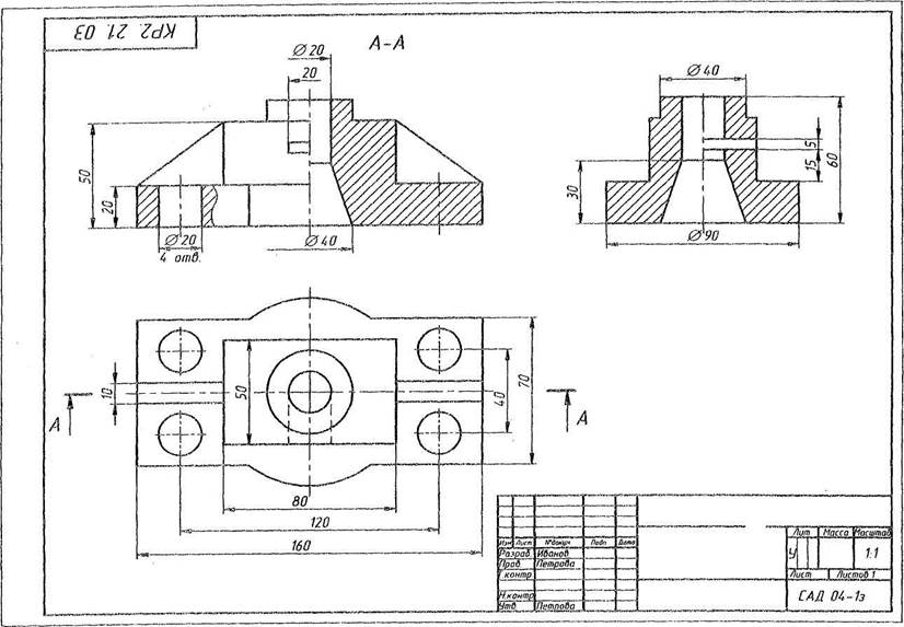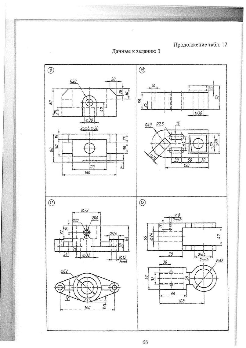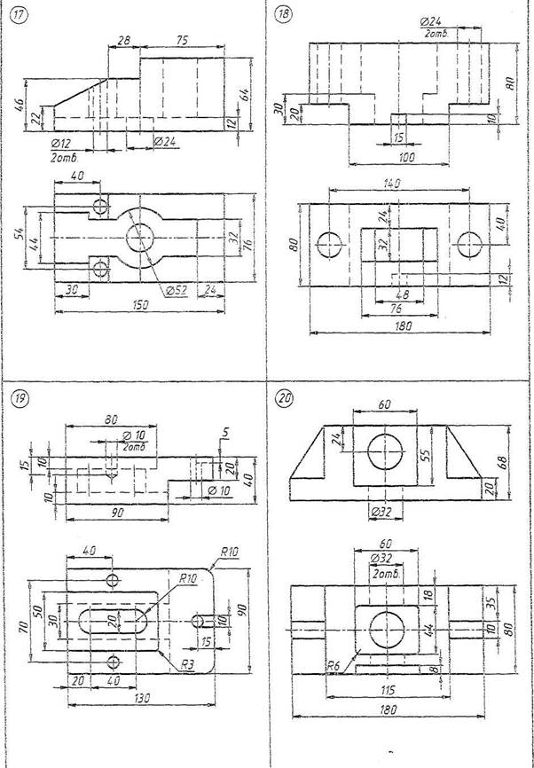 ЗАДАНИЕ 3. ИЗОБРАЖЕНИЯ - РАЗРЕЗЫ (ОСНОВАНИЕ) Построить чертеж детали, применив необходимые разрезы. Выполнить аксонометрию детали. Данные к заданию приведены в табл. 12; пример выполнения на рис. 47 и 48. ВЫПОЛНЕНИЕ. Данное задание базируется на материале, используемом в заданиях 1 и 2. Ознакомившись с формой детали и проанализировав необходимость применения разрезов, на листе форматом A3 выполнить изображения, разместив разрезы на соответствующих видах (при необходимости разрезы обозначить). Нанести выносные и размерные линии и указать размеры. На другом листе форматом A3 построить наглядное изображение детали - прямоугольную изометрию с вырезом (см. рис. 48). РАЗРЕЗЫ (ГОСТ 2.305-68). В данном задании наряду с простыми разрезами (они были рассмотрены в задании 2) можно применить и сложные разрезы. На рис. 43, а показан сложный ступенчатый разрез, выполненный на главном изображении. Сечения, получившиеся в двух параллельных секущих плоскостях, условно совмещены. Переход от одной секущей плоскости к другой, отмеченный на виде сверху пересечением штрихов, на самом разрезе не показывается. Размеры штрихов (уголков) приведены на рис. 43, б. При выполнении разреза на рис. 43, а применена условность: ребра жесткости в разрезе не заштриховывают, если секущая плоскость направлена вдоль ребра.