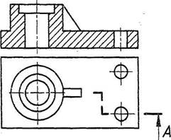 Рис. 25 Рис. 26 Если вид (основной, местный) расположен вне проекционной связи е главным, то его обозначают (см. рис. 25, 26). При обозначении вида стрелкой указывают направление взгляда, обозначаемое прописной буквой русского алфавита (высотой 7 или 10 мм), той же буквой обозначают построенный вид.
