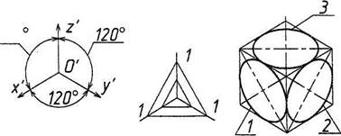 Рис. 44 Рис. 45 Размеры небольших конических и пирамидальных срезов (фасок) на деталях проставляются, как показано на рис. 45. АКСОНОМЕТРИЧЕСКИЕ ПРОЕКЦИИ (ГОСТ 2.317-69). Аксонометрические проекции применяются в качестве вспомогательных к чертежам в тех случаях, когда требуется наглядное изображение детали. В данном задании рекомендуется выполнить одну из пяти стандартных аксонометрических проекций - прямоугольную изометрическую. На рис. 46 приведены: положение аксонометрических осей (рис. 46, а), коэффициенты искажения линейных размеров по осям и штриховка (рис. 46, б), расположение осей эллипсов (рис. 46, в), пример изометрии детали с вырезом (рис. 46, г). На рис. 46, в: 1, 2, 3 - эллипсы, большая ось которых расположена под углом 90° к осям х, у, z соответственно и равна \, 22d, а малая ось -0, 71 d, где d - диаметр окружности.
