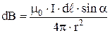 Отметим, что вектор перпендикулярен векторам и . В скалярном виде закон Био-Савара-Лапласа можно записать: , где α – угол между векторами и .