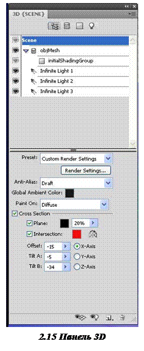 При виборі верхнього рівня ієрархії – Scene. Відображуватимуться наступні параметри: · Preset – тут можна вибрати який із заготовлених типів візуалізації потрібно використовувати, або відкрити діалогове вікно Render Settings за допомогою однойменної кнопки для створення і вживання своїх налаштувань візуалізації; · Anti-Alias – режим згладжування за замовчуванням містить параметр Draft. Із випадаючого списку можна також вибрати один з інших рівнів якості – Better, Best; · Global Ambient Color – параметр вказує якого кольору і як сильно виявлятиметься довколишнє освітлення, чим світліше відтінок тим більше яскравим буде колір оточення і його сила, можна задати будь-який колір для досягнення бажаного результату; · Paint on: – цей параметр дозволяє не використовуючи меню 3D вибирати якого типу текстури створюватиме користувач; · Cross Section – ця група містить інструменти для створення площин перетину. Це особливо корисно при використанні Adobe Photoshop CC для машинобудування і підготовки демонстраційних матеріалів з 3D моделями з CAD додатків; · Plane – задає колір і прозорість площини перетину; · Intersection – задає контур розрізу він позначається чорним кольором за замовчуванням, але краще за нього робити червоним так буде краще помітні кромки геометрії; · Offset – зачеплений положення січної площини; · Tilt A, Tilt B – параметри, що задають кут повороту площини перетину; · X-Axis, Y-axis, Z-axis – задають вісь на якій буде розташована площина перетину. Останні параметри матеріалів і джерел світла також прості і швидко вивчаються, адже візуалізація тривимірних моделей в Adobe Photoshop значно простіша, ніж в професійних редакторах тривимірної графіки і анімації – таких як Maya, 3ds Мах, Softimage XSI і ін.