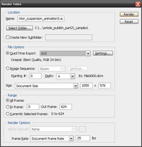 Рисунок 2.16 Робочий простір Photoshop при створенні анімації 3D об'єкту Негативною стороною всієї візуалізації анімації в Photoshop CC – дуже повільна візуалізація. Також для досягнення максимальної швидкості роботи додатка необхідна наявність високопродуктивною графічної плати – наприклад, NVIDIA Quadro або ATI FIREGL. Аби створити відео-файл необхідно експортувати анімацію. Для цього призначена команда File à Export à Render Video. Відкриється діалогове вікно Render Video (рис. 2.17) де встановлюють параметри виводу. Після натиснення кнопки Render почнеться візуалізація відео секвенції. Для прикладу, я створила невелику простеньку анімацію моделі шасі, сама модель створена в Autodesk Inventor, експортована через Autodesk 3ds Мах у формат *.obj і далі імпортована в Adobe Photoshop CC. У додаткових матеріалах готовий psd файл називається inventor_suspension_animation.psd.