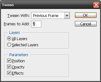 Рисунок 2.19 Діалогове вікно Tween · В.3 – Convert to Timeline Animation – здійснює конвертація кадрів анімації з режиму Frames в режим Timeline. Всі кадри від ображуються в даному режимі у вигляді ключових кадрів в кожному кадрі анімації; · В.4 – кадр анімації. У верхньому лівому кутку знаходиться його порядковий номер, внизу кадру розташовано меню, яке дозволяє вказати час затримки кадру в секундах.