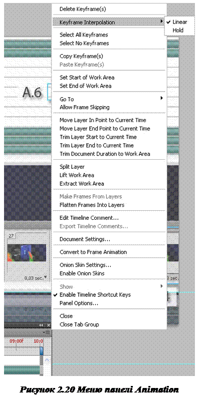 Отже, в меню представлені наступні команди: · Delete Keyframe(s) – видалити ключовий кадр(и); · Keyframe Interpolati-on – в Photoshop підтримуються лише два типи інтерполяції між ключовими кадрами – Linear і Hold. · Select All Keyframes, Select No Keyframes – виділення всіх ключів анімації, або зняття виділення з ключів анімації; · Copy Keyframe(s), Paste Keyframe(s) – копіювати і \ або вставити ключові кадри; · Set Start of Work Area, Set End of Work Area – встановлюють початкове і кінцеве положення маркерів робочої області. Це корисно коли виконується попередня візуалізація або тестовий експорт створеної анімації. Наприклад, якщо створено анімацію, але потрібно проглянути лише частину з неї або певний момент можна скористатися цими пунктами і встановити початок і кінець кліпа; · Go To à Time, Next Frame, Previews Frame, First Frame, Last Frame, Work Area Start, Work Area End – даний пункт меню відповідає за швидку навігацію по Timeline, як по кадрах так і за всією тривалістю композиції; · Allow Frame Skipping – дана команда відповідає за оптимізацію відтворення анімації. Якщо вона активна, то Photoshop відтворюватиме анімацію з пропусканням кадрів оскільки при композиції їх потрібно візуалізувати, а це займає час особливо в складних композиціях. Якщо дана команда не активна, то Photoshop розраховуватиме кожен кадр анімації і композиції; · Move Layer In Point to Current Time, Move Layer End Point to Current Time – дані команди меню встановлюють початкову і кінцеву точки шару в кадрі де стоїть слайдер поточного часу; · Trim Layer Start to Current Time, Trim Layer End to Current Time, Trim Document Duration to Work Area – дані команди виконують обрізання по поточній позиції слайда початку і кінця шару, а також виконують обрізання документа за тривалістю композиції; · Split Layer – розрізає шар на два окремих шари з установкою початкової і кінцевої точки шарів в місці розриву; · Lift Work Area – створює новий шар і встановлює його початкову і кінцеві точки. За замовчуванням початкова точка ставиться в кінці робочої області, тому може виникнути проблема з тим, що шар не відображуватиметься. Просто потрібно встановити початкову точку у іншому місці; · Extract Work Area – виключає шар з робочої області. Його можна повернути перетягнувши шар з початкової точки; · Flatten Frames Into Layers – дана команда створює шари по кожному кадру анімації; · Make Frames From Layers – дана команда створює кадри з шарів створених командою Flatten Frames Into Layers розміщує їх за часом. Виглядає Timeline з шарами у вигляді драбинки; · Edit Timeline Comment, Export Timeline Comments – команди редагування коментарів до Timeline і їх експорту. Для додавання коментаря до поточного кадру досить вибрати команду Edit Timeline Comment і в діалоговому вікні Edit Timeline Comment записати коментар; · Document Settings – дозволяє змінити тривалість композиції і анімації, і вибрати швидкість відтворення (fps). Для зміни часу слід вибрати в меню Document Timeline Settings і в діалоговому вікні, що відкрилося, виставити значення в полі Duration. А для зміни частоти кадрів, вибрати в списку Frame Rate частоту, яку потрібно використовувати, – 24, 25, 29, 97 і так далі кадрів \ сек;