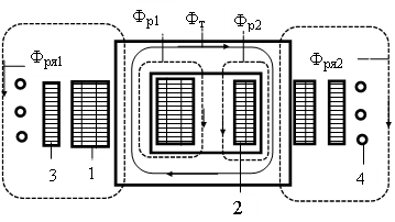 В простейшем случае такие трансформаторы (рис. 2.16.) имеют по одной первичной 1 и вторичной 2 обмотки, расположенных на различных стержнях. Потоки рассеянная замыкаются не только по воздуху в окне (Фр1 и Фр2), но также между верхнем и нижнем ярмом (Фря1 и Фря2).