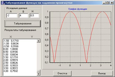 #include < math.h> void fastcall TForm1:: Button1Click(TObject *Sender) { float A, B, h, x, y; A = StrToFloat (Edit1-> Text); B = StrToFloat (Edit2-> Text); h = StrToFloat (Edit3-> Text); for (x = A; x < = B + 0.1 * h; x += h) {y = pow(cos(pow(fabs (x), 1./ 3)), 2); Memo1 -> Lines -> Add(FormatFloat(" 0.00", x) + " " + FormatFloat(" 0.0000", y)); Series1 -> AddXY(x, y, “”, clRed); }}