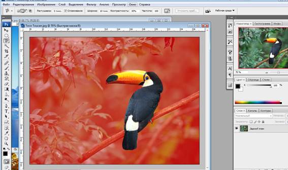 рис. 3 Вид изображения после создания быстрой маски Теперь посмотрим на палитру каналы. Кроме составного изображения RGB, каналов красного, зелёного, синего, мы видим канал быстрая маска. Этот канал выделен, а значит, активен.