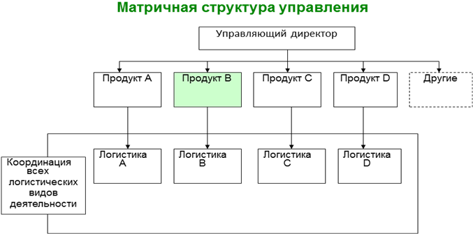 По аналогии с историческими этапами развития логистики по уровню охвата логистическим управлением различных сфер деятельности предприятий, эволюция логистических структур на предприятиях проходит также следующие три стадии. На первой стадии основная функции логистики - доставка продукции предприятия в розничную сеть. На этой стадии логистические функции распылены между различными подразделениями, но появляются тенденции к объединению логисических функций в организационные подсистемы. На второй стадии к доставке продукции в розничную сеть добавляются и другие: организация хранения на складах, оптимизация запасов, обслуживание клиентуры и т.д. Логистические функции не только расширяются, но и объединяются большинство логистических отделов, и создаются системы доставки товаров по заказам клиента. На третьей стадии происходит полное объединение всех логистических отделов на предприятии. В набор логистических задач включаются построение логистической системы, участие в планировании производства и прогнозировании продаж; организация закупок материальных ресурсов для предприятия, организация поставок товаров за рубеж и др. В настоящее время наиболее распространенными организационными структурами отделов логистики являются: линейная и матричная структуры. Они приведены на рисунках.