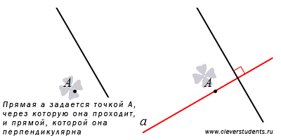Четвертый способ задания прямой заключается в том, что следует указать точку, через которую она проходит, и прямую, которой она перпендикулярна. Действительно, через заданную точку плоскости проходит единственная прямая, перпендикулярная данной прямой. Оставим этот факт без доказательства. Смотрите также материал статьи уравнение прямой, проходящей через заданную точку перпендикулярно заданной прямой.