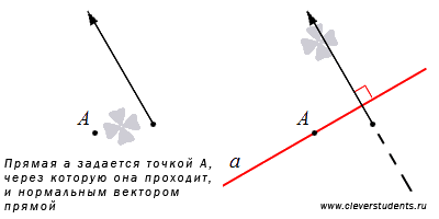 Наконец, прямую на плоскости можно задать, указав точку, через которую она проходит, и нормальный вектор прямой. Если известны координаты точки, лежащей на заданной прямой, и координаты нормального вектора прямой, то есть возможность записать общее уравнение прямой.