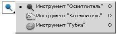 Рис. 1.14. Инструменты локального размытия и резкости Инструменты Dodge (Осветлитель) и Burn (Затемнитель) делают объекты более светлыми или более тусклыми. Эти средства предназначены для локальной (местной) коррекции освещенности или изменения значения яркости, чтобы выделить или скрыть некоторые детали - рис. 1.15.