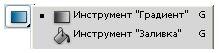Рис. 2.23. Инструменты заливки Paint Bucket (Заливка) - заливает изображение цветом или текстурой. Параметры инструмента расположены на палитре атрибутов этого инструмента. Здесь в списке заливок можно выбрать, что именно использовать в качестве заливки: Foreground (Основной цвет) - цвет переднего плана или Pattern (Узор), то есть, заливку текстурой. Список Mode (Режим) определяет режим наложения пикселей при применении данного инструмента. Флажок Anti-alias (Сглаживание) служит для смягчения неровностей краев заливки. Установка флажка Contiguous (Смежные пиксели) определяет, заливать ли по цветовой близости только соседние пиксели или пиксели на всем изображении. Ползунок Opacity (Непрозрачность) позволяет регулировать степень прозрачности заливки.