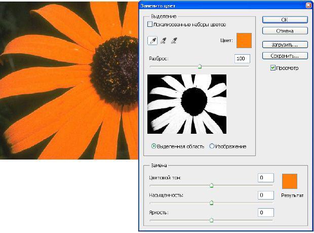 Рис. 3.29. Исходное изображение Выберите команду Image (Изображение) | Adjustments (Коррекция) | Replace Color (Заменить цвет). В возникшем в результате выполнения команды окне установите переключатель Selection (Выделение), чтобы видеть в окне предварительного просмотра маску. Установите флажок Preview (Предварительный просмотр), чтобы видеть, как настройка цвета будет отражаться на изображении. Инструментом Пипетка щелкните на самом темном месте фона. Часть фона выделилась. Если вы щелкните не фон, а цветок, то будет производиться не замена цвета фона, а замена цвета цветка - рис. 3.30.