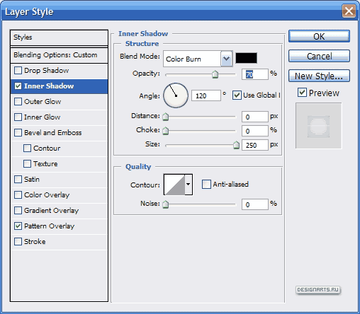 9. Ну, сделали? Отлично! Теперь давайте снова создадим новый слой, как бы банально это не звучало, и зальём его любым цветом. Непрозрачность Fill уменьшим до 0%. Сейчас заходим в Blending Options только что созданного слоя (кликаем на этом слое правой клавишей и выбираем пункт Blending Options), перейдём на вкладку Inner Shadow и сделаем как показано ниже: