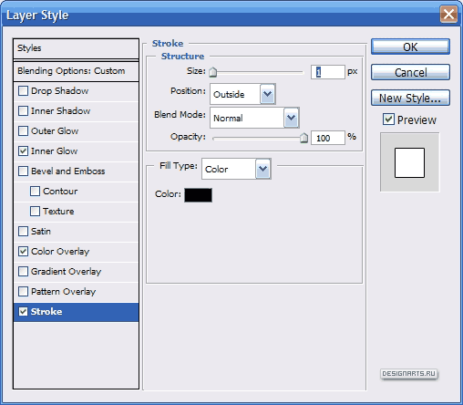 13. Теперь зальём выделение любым цветом и зайдём в Blending Options. На вкладке Color Overlay сделаем следующее: