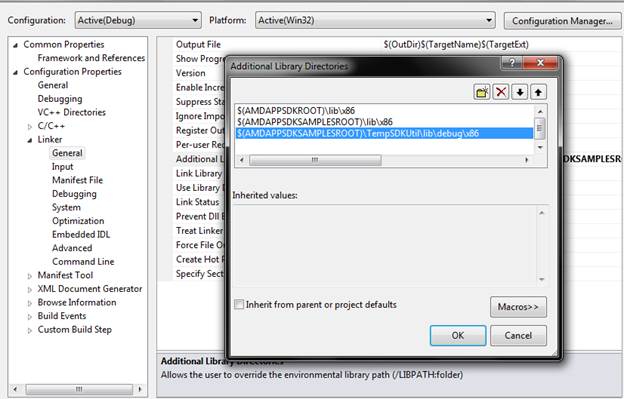 Во вкладке Linker -> General в поле Additional Library Directories вбиваем следующие шаманские строчки: $(AMDAPPSDKROOT)\lib\x86 $(AMDAPPSDKSAMPLESROOT)\lib\x86 $(AMDAPPSDKSAMPLESROOT)\TempSDKUtil\lib\debug\x86