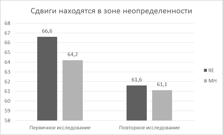 Рисунок 9 - Средние значения показателей RE (эмоциональное состояние) и MH (психологический компонент здоровья) по методике «SF-36» Из таблицы 7 и рисунков 8, 9 видно, что после проведения психокоррекционного тренинга значимо снизились показатели общего здоровья и анозогнозического типа отношения к болезни. Значения показателей эмоционального состояния и психологического компонента здоровья до и после тренинга значимо не отличаются, попали в зону неопределенности значимости различий. Но средние значения по обоим показателям снизились. Отметим, что при статистической обработке данных не произошло значимых изменений показателя обсессивно-фобических нарушений (Оф). Однако, полученные средние значение до тренинга свидетельствовали о попадании данного показателя в критическое значение (болезненное состояние по шкале), а после тренинга значения по данному показателю находятся в пределах нормы. Таким образом, можно считать, что данная психокоррекционная программа является эффективной при коррекции анозогнозического типа отношения к болезни и обсессивно-фобических нарушений у пациентов с туберкулезом легких.