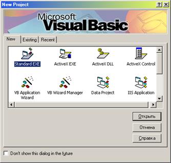 Вскоре вы научитесь пользоваться некоторыми шаблонами проектов. В большинстве уроков используется шаблон Standard EXE, но в уроке 17, «Использование ActiveX», применяются некоторые шаблоны ActiveX. На вкладке Existing можно выбрать существующий проект. Это может быть проект примера, входящего в комплект Visual Basic, или же проект, над которым вы работали в прошлом. Чем больше вы будете работать с Visual Basic, тем чаще вам придется обращаться к этой вкладке. Наконец, вкладка Recent позволяет выбрать один из недавно использовавшихся проектов. Внешне она похожа на Existing, но на ней перечисляются лишь те проекты, над которыми вы работали в последнее время, а не все существующие проекты. Начать работу над проектом в Visual Basic можно с любой вкладки. Возможно, вы обратили внимание на флажок в нижней части окна — Don't Show This Dialog in the Future. Если вы предпочитаете обходиться без выбора типа проекта, достаточно установить его, и при следующем запуске Visual Basic окно больше не появится.