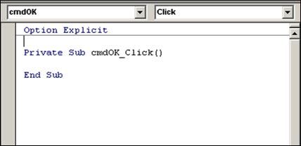 На этот раз свойство Caption определяет текст, находящийся на кнопке. Ампер-сенд (&) перед первым символом означает, что вместо щелчка мышью кнопку можно активизировать с клавиатуры (в данном случае сочетанием клавиш Alt+О). Подобные сокращения следует назначать по мнемоническому принципу (например, буква «О» для кнопки ОК). 11. Теперь дважды щелкните на кнопке cmdOK. Двойной щелчок на элементе (или форме) открывает окно программы со стандартным событием. Для кнопки стандартным является событие Click. На экране должен появиться шаблон процедуры (или заготовка) cmdOK_Click (рис. 1.17). Не обращайте внимания на префикс Private Sub; сейчас важно лишь имя процедуры, cmdOK_Click — оно означает, что после того, как пользователь нажмет кнопку cmdOK, будет выполнен код, находящийся в этой процедуре.
