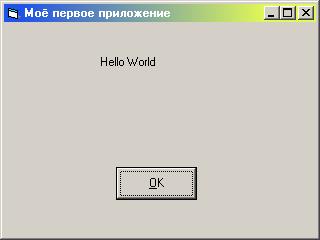 Когда пользователь нажимает кнопку cmdOK, происходит событие cmdOK_Click. В данном случае оно сообщает форме о том, что она должна выгрузить себя. Поскольку в нашем приложении нет других форм, выгрузка формы приводит к завершению приложения. 13. Выполните команду File > Save Project. Введите имя формы frmWorld.frm и имя проекта HelloWorld.vbp. Перед сохранением проекта сохраняются все входящие в него файлы. В нашем приложении имеется всего одна форма, которой соответствует один файл. В сущности, файл проекта представляет собой список файлов компонентов. 14. ПРИМЕЧАНИЕ Обратите внимание — наша форма описывается тремя атрибутами: свойством Name (frmHelloWorld), свойством Caption (Мое первое приложение) и именем файла (frmWorld.frm). Вы должны четко понимать, чем отличаются эти атрибуты. Свойство Caption выводится в заголовке формы, свойство Name служит для работы с формой в программе, а имя файла используется файлом проекта и операционной системой.