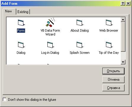 Как видите, выбор достаточно широк — диалоговое окно About (About Dialog), заставка (Splash Screen), окно с полезными советами (Tip of the Day) и даже окно-броузер (Web Browser)! После того как вы выберете форму в окне Wizard, Visual Basic создаст шаблон с необходимой графикой и кодом и включит его в проект. Form Wizard заметно экономит время, поскольку он автоматически генерирует часть программного кода для формы.