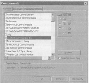 Следующий пример показывает, как вывести отчет из приложения: 1. Создайте в Visual Basic новый проект командой File > New. 2. В диалоговом окне New Project выберите значок Standard EXE. Закройте диалоговое окно кнопкой ОК. 3. Задайте свойству Name проекта значение ReportDemo. 4. Задайте свойству Name формы Form1 значение frmMain, а свойству Caption — значение Вывод отчетов. 5. Щелкните правой кнопкой мыши на панели элементов и выберите из контекстного меню команду Components. 6. В диалоговом окне Components установите флажок рядом со строкой Crystal Report Control4.6(pиc.9.16). 7. Нажмите кнопку OK, чтобы поместить элемент на панель. 8. Создайте на форме frmMain кнопку. Задайте ее свойству Name значение cmdPrint, а свойству Caption — значение & Print. 9. Поместите на форму элемент Crystal Report и задайте его свойству Name значение rpt. 10. Щелкните на строке (Custom) в окне свойств элемента Crystal Report. Открывается диалоговое окно Property Pages. 11. Нажмите кнопку справа от поля ReportFileName. Укажите отчет, созданный в предыдущем примере, в диалоговом окне Choose Report. Выберите файл кнопкой Open.