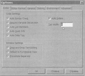 Еще одно средство сделать вашу программу более понятной и наглядной — использовать символы табуляции и пробелы для визуального упорядочения кода в окне программы. По умолчанию одна позиция табуляции в Visual Basic равна четырем пробелам, однако это значение можно изменить — выполните команду Tools > Options и перейдите на вкладку Editor в диалоговом окне Options (рис. 12.1).