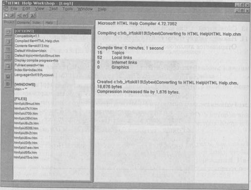 15. Перейдите на вкладку Compiler. 16. Установите флажок Compile Full-Text Search Information и нажмите кнопку ОК. Компилятор просматривает все разделы и составляет индекс. 17. Нажмите кнопку Save All Project Files and Compile (слева внизу на панели инструментов вкладки Project). Компилятор обрабатывает все файлы проекта и строит по ним объединенный сжатый HTML-файл, в котором содержится вся справочная система. После завершения работы компилятора в правой панели Help Workshop появляется протокол компиляции (как на рис. 13.16). Нажмите кнопку View Compiled File на верхней панели инструментов (кнопка с красными очками). Когда вам будет предложено выбрать откомпилированный файл, ваш файл уже будет указан в поле Compiled Field. Нажав кнопку View, вы увидите свой справочный файл (рис. 13.17).