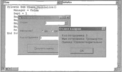 If hr.GetRecord = True Then msg = " Код сотрудника: " & _ Trim$(Str$(hr.EmpID)) & vbCrLf msg = msg & " Имя сотрудника: " & _ Trim$(Str$(hr.EmpName)) & vbCrLf msg = msg & " Оценка: & hr.EmpPerformance MsgBox msg Else msg = " He удалось получить сведения! " & vbCrLf msg = msg & hr.Reason End If End Sub